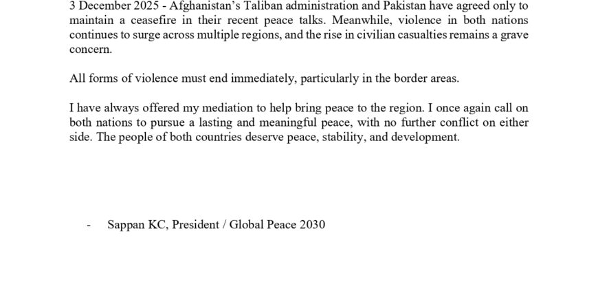 Mr. KC's Statement on Pakistan–Afghanistan Peace Talks 3 December 2025 - Afghanistan’s Taliban administration and Pakistan have agreed only to maintain a ceasefire in their recent peace talks. Meanwhile, violence in both nations continues to surge across multiple regions, and the rise in civilian casualties remains a grave concern. All