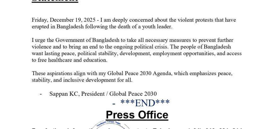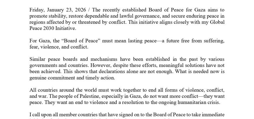 Mr. Sappan KC’s Remarks on the Gaza “Board of Peace” Statement Friday, January 23, 2026 / The recently established Board of Peace for Gaza aims to promote stability, restore dependable and lawful governance, and secure enduring peace in regions affected by or threatened by conflict. This initiative aligns closely with