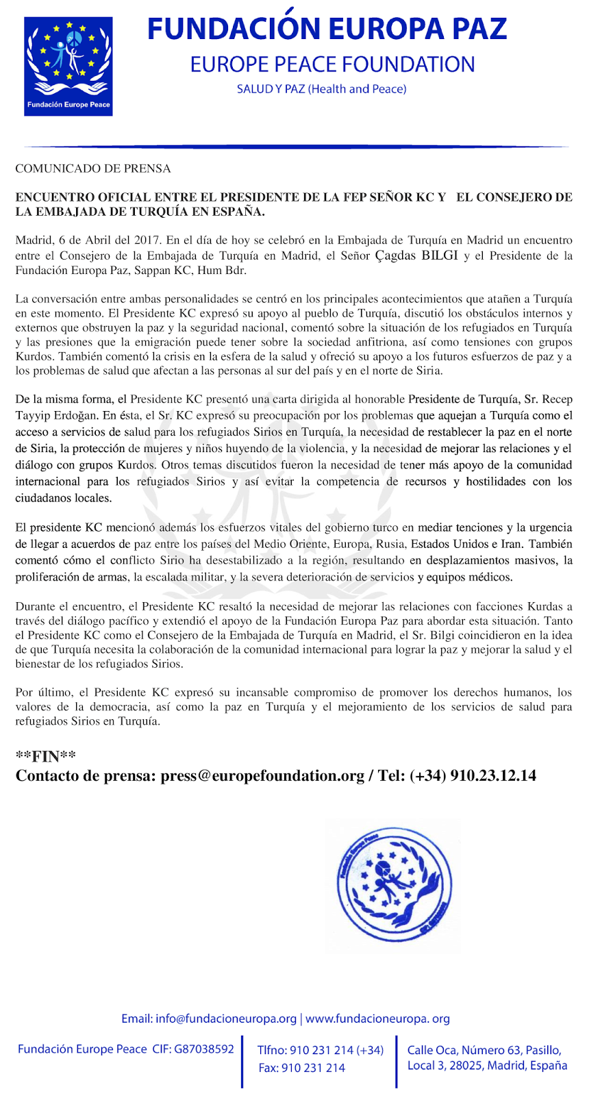Durante el encuentro, el Presidente KC resaltó la necesidad de mejorar las relaciones con facciones Kurdas a través del diálogo pacífico y extendió el apoyo de la Fundación Europa Paz para abordar esta situación. Tanto el Presidente KC como el Consejero de la Embajada de Turquía en Madrid, el Sr. Bilgi coincidieron en la idea de que Turquía necesita la colaboración de la comunidad internacional para lograr la paz y mejorar la salud y el bienestar de los refugiados Sirios.