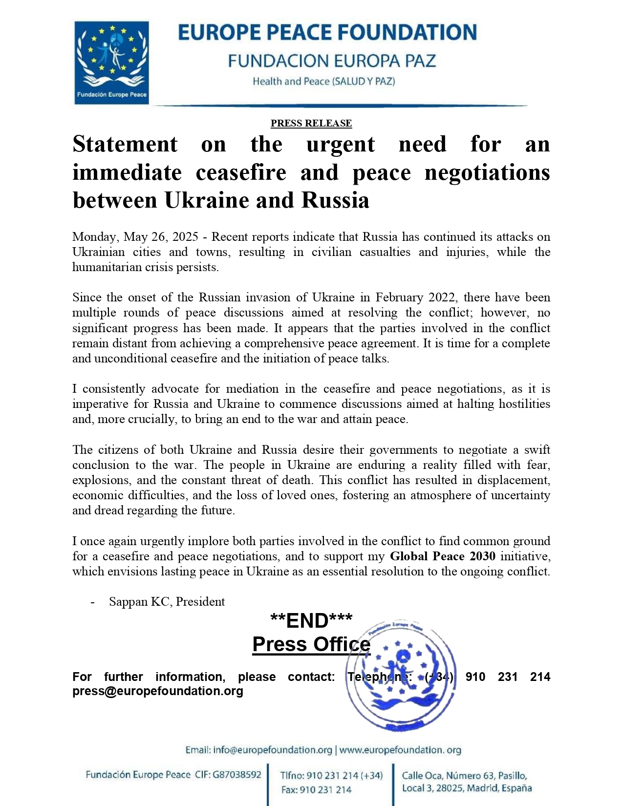 I once again urgently implore both parties involved in the conflict to find common ground for a ceasefire and peace negotiations, and to support my Global Peace 2030 initiative, which envisions lasting peace in Ukraine as an essential resolution to the ongoing conflict.