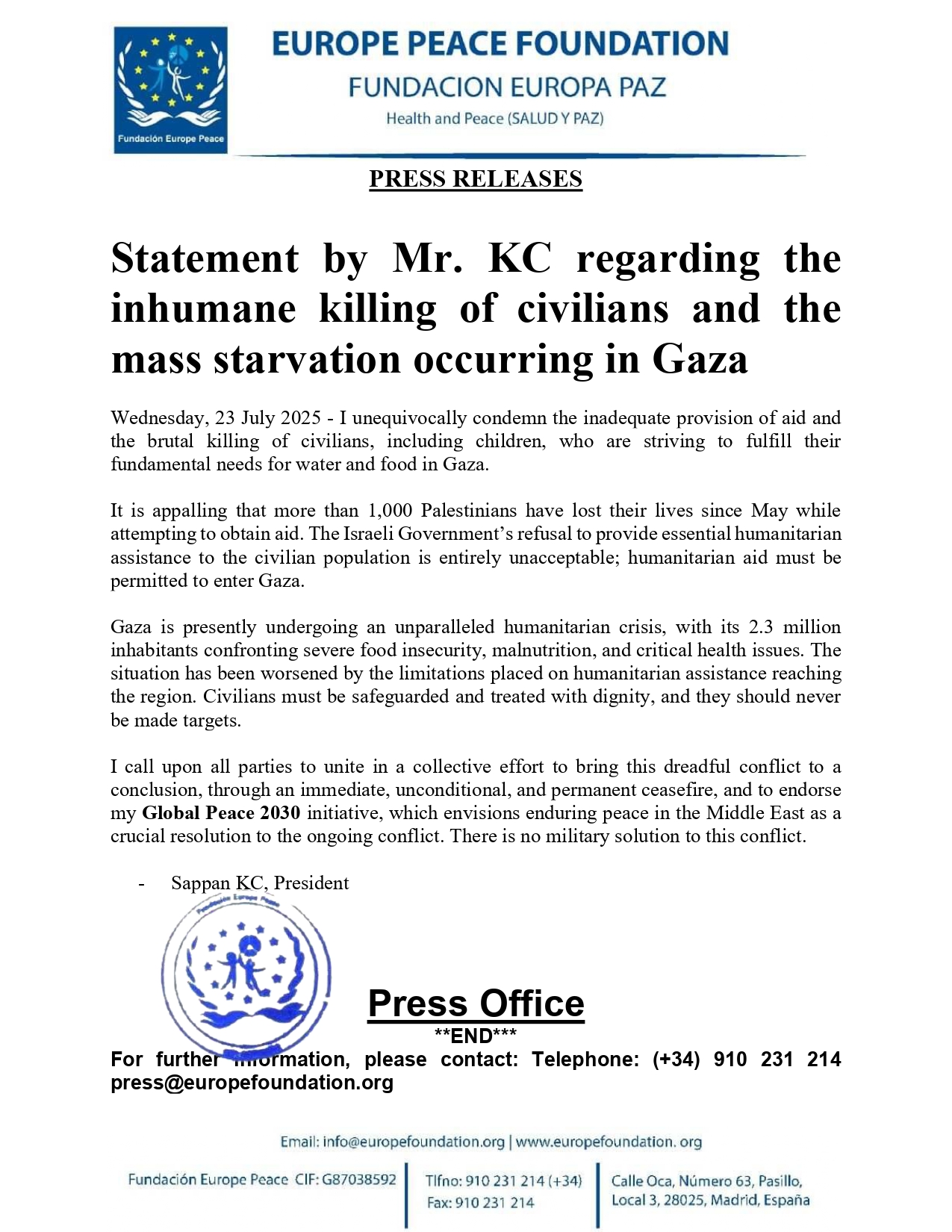 Statement by Mr. KC regarding the inhumane killing of civilians and the mass starvation occurring in Gaza