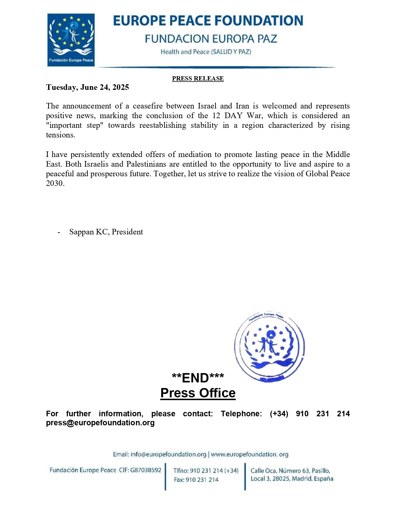 The announcement of a ceasefire between Israel and Iran is welcomed and represents positive news, marking the conclusion of the 12 DAY War, which is considered an “important step” towards reestablishing stability in a region characterized by rising tensions.