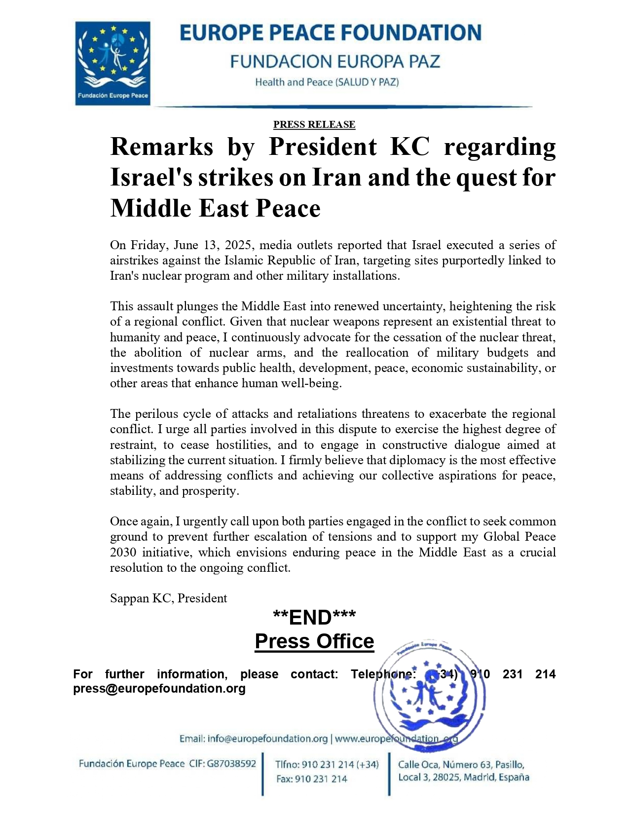 Once again, I urgently call upon both parties engaged in the conflict to seek common ground to prevent further escalation of tensions and to support my Global Peace 2030 initiative, which envisions enduring peace in the Middle East as a crucial resolution to the ongoing conflict.
