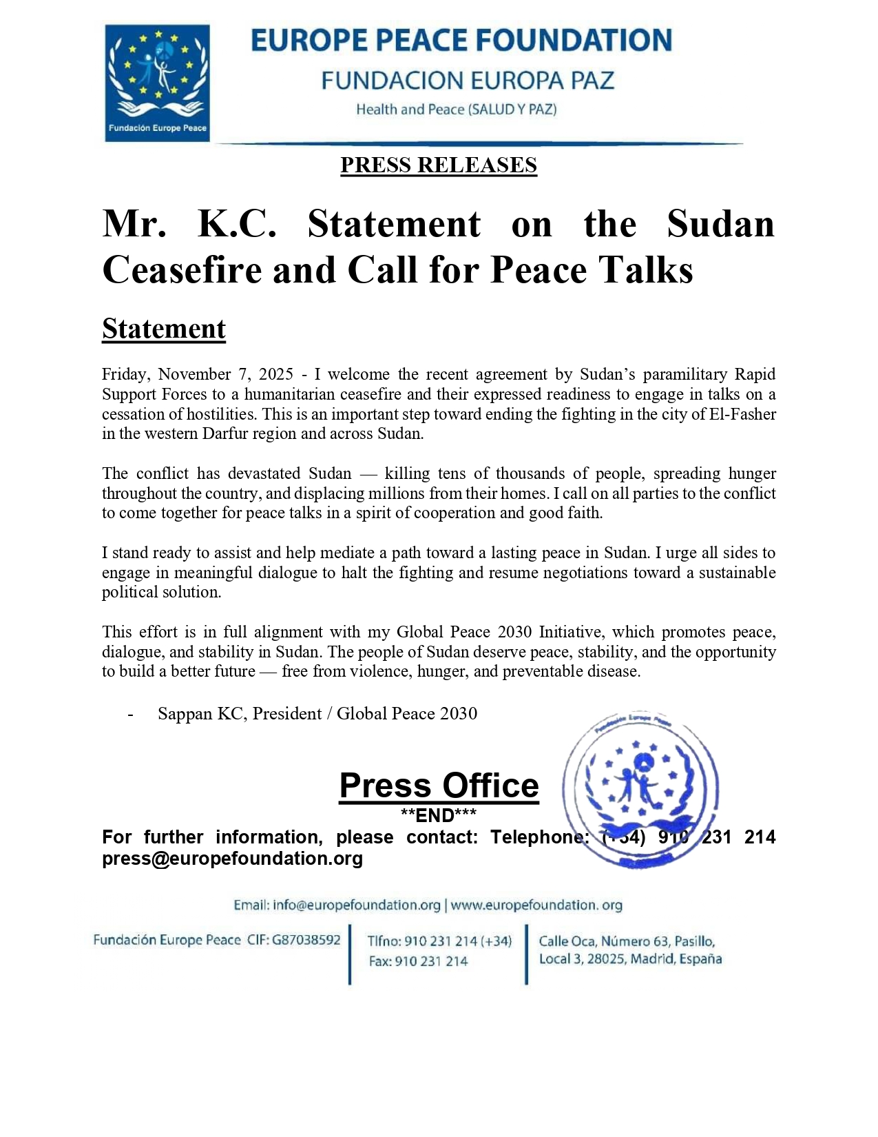 This effort is in full alignment with my Global Peace 2030 Initiative, which promotes peace, dialogue, and stability in Sudan. The people of Sudan deserve peace, stability, and the opportunity to build a better future — free from violence, hunger, and preventable disease.