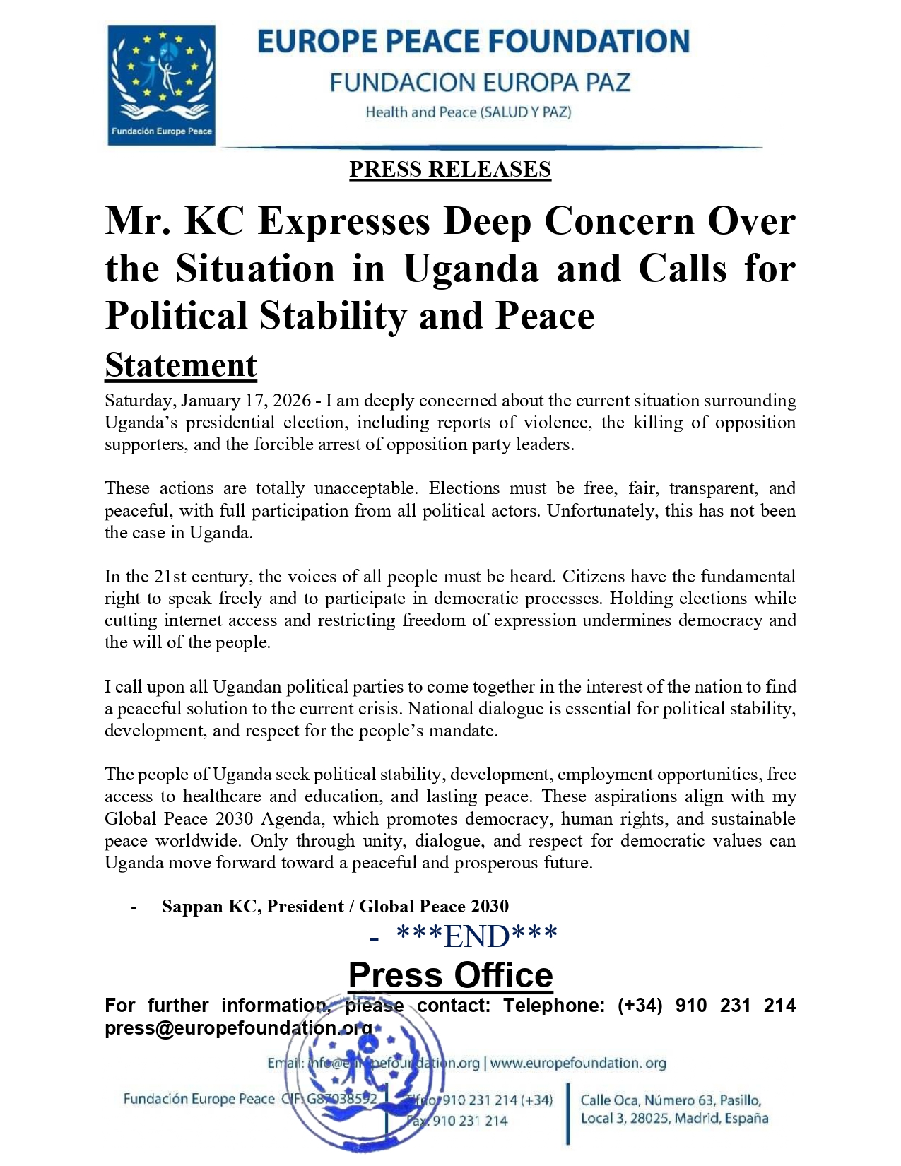 The people of Uganda seek political stability, development, employment opportunities, free access to healthcare and education, and lasting peace. These aspirations align with my Global Peace 2030 Agenda, which promotes democracy, human rights, and sustainable peace worldwide. Only through unity, dialogue, and respect for democratic values can Uganda move forward toward a peaceful and prosperous future.