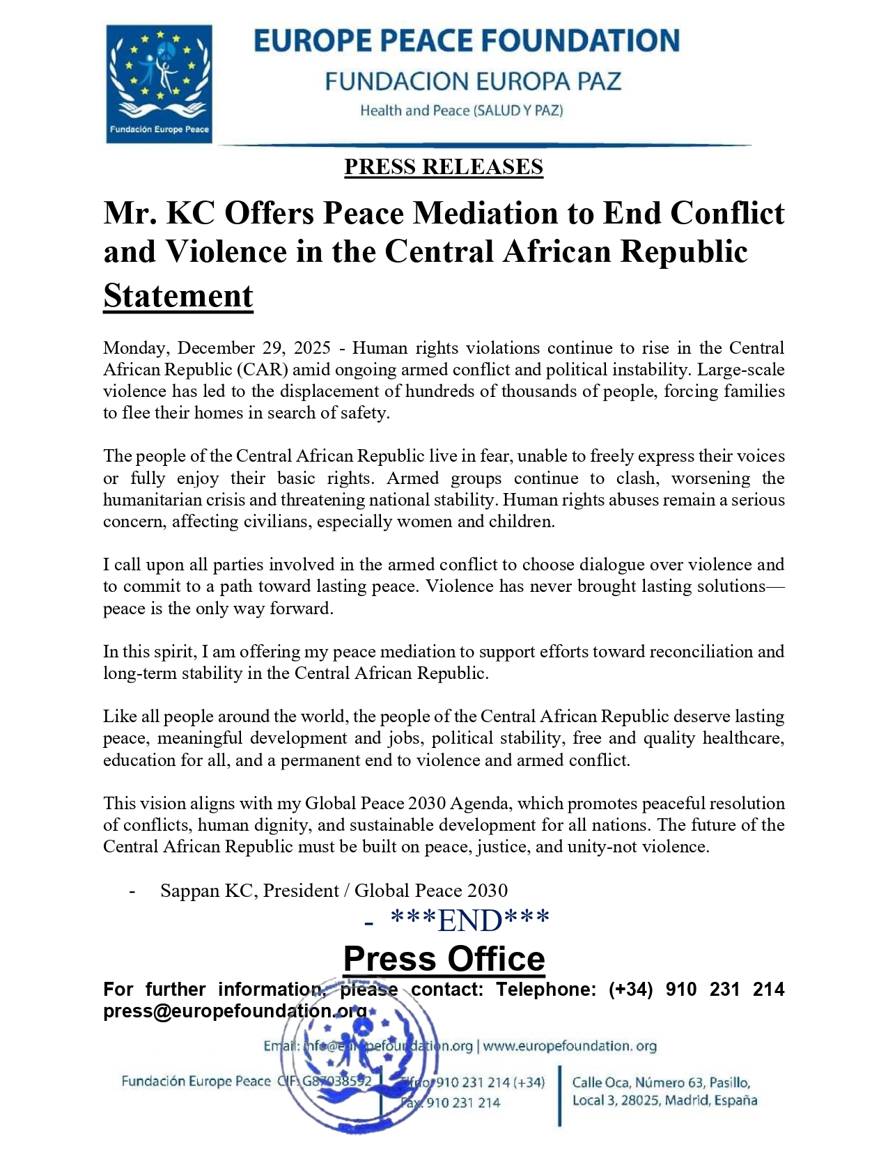 This vision aligns with my Global Peace 2030 Agenda, which promotes peaceful resolution of conflicts, human dignity, and sustainable development for all nations. The future of the Central African Republic must be built on peace, justice, and unity-not violence.