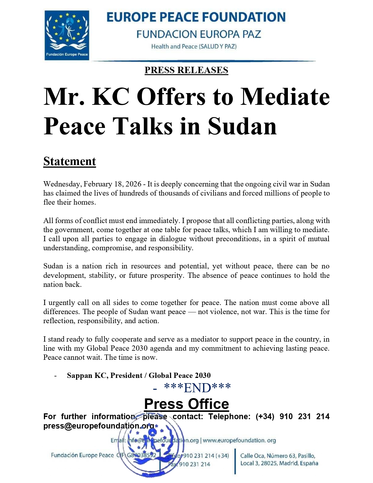 Wednesday, February 18, 2026 – President Mr. Sappan KC has formally offered to mediate peace talks to help bring an end to the ongoing conflict in Sudan. He calls on all conflicting parties and government representatives to immediately cease hostilities and come together for constructive and inclusive dialogue.