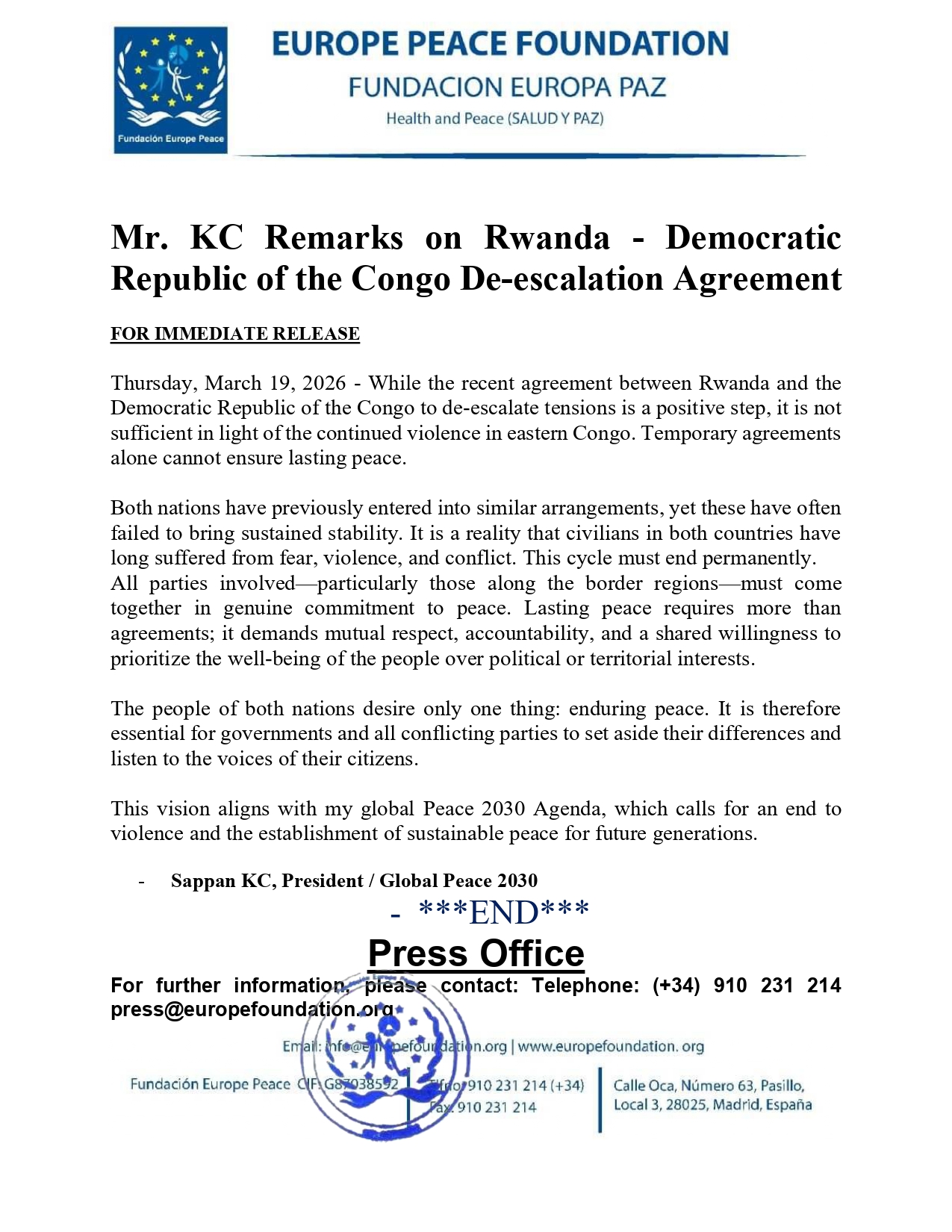This vision aligns with my global Peace 2030 Agenda, which calls for an end to violence and the establishment of sustainable peace for future generations.
