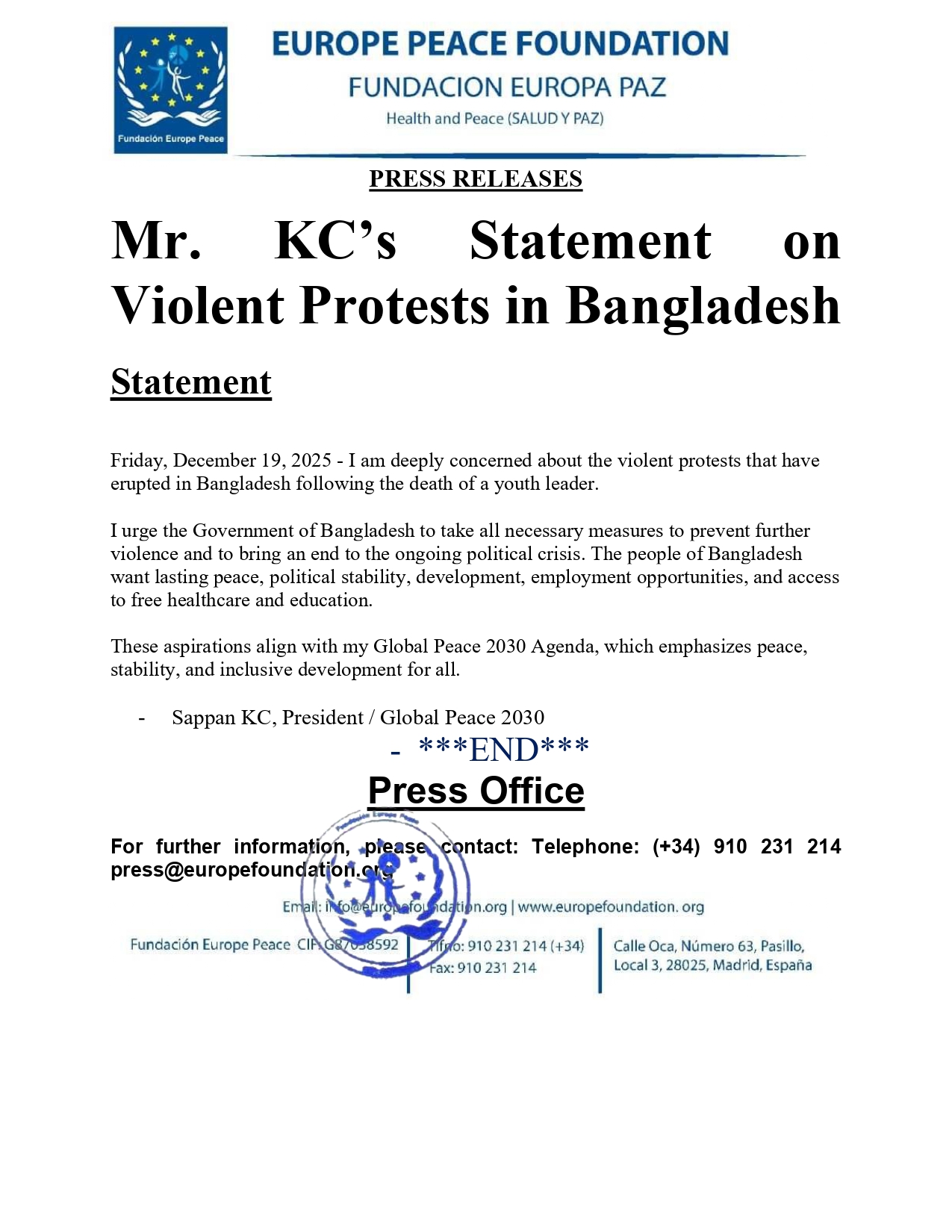 Friday, December 19, 2025 – I am deeply concerned about the violent protests that have erupted in Bangladesh following the death of a youth leader.