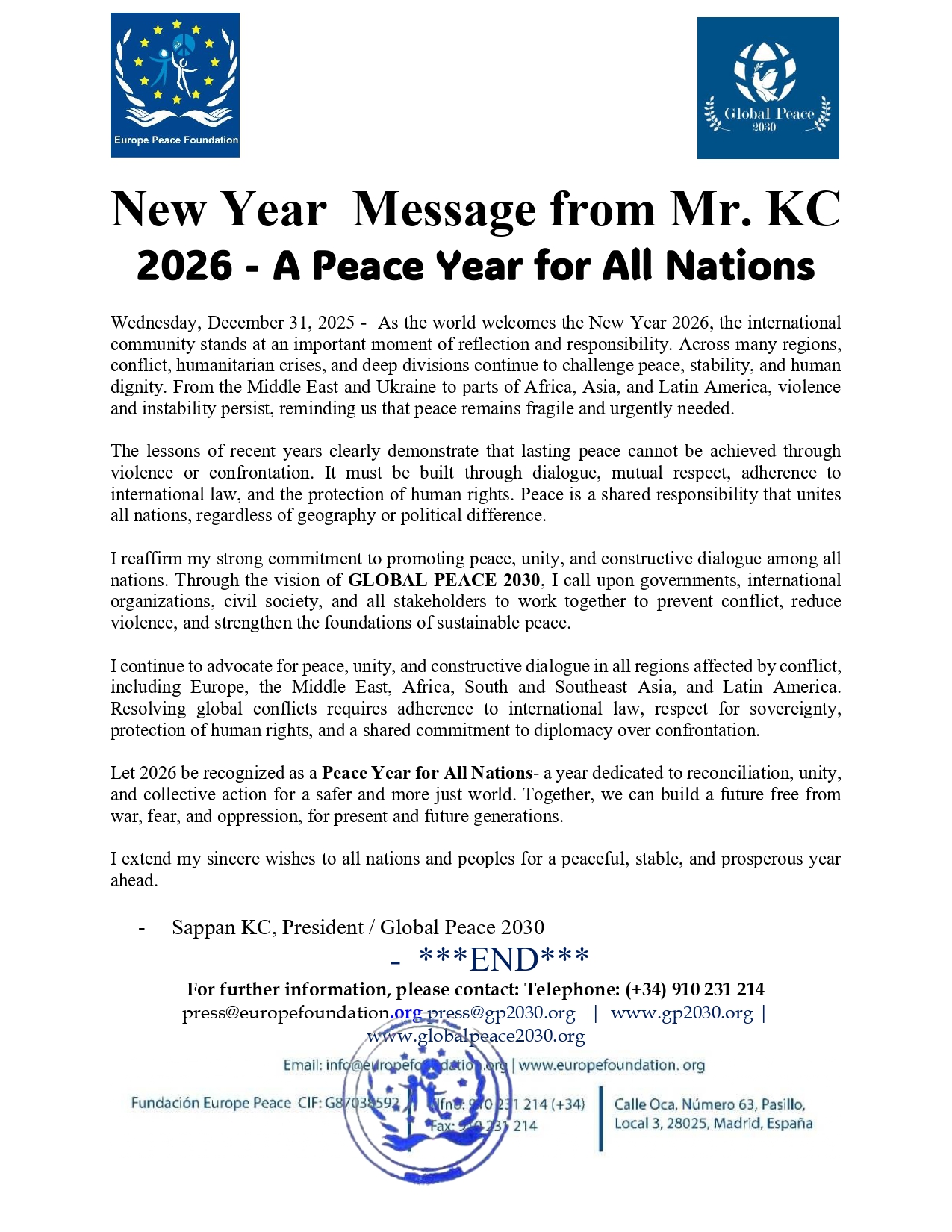 Let 2026 be recognized as a Peace Year for All Nations- a year dedicated to reconciliation, unity, and collective action for a safer and more just world. Together, we can build a future free from war, fear, and oppression, for present and future generations.
