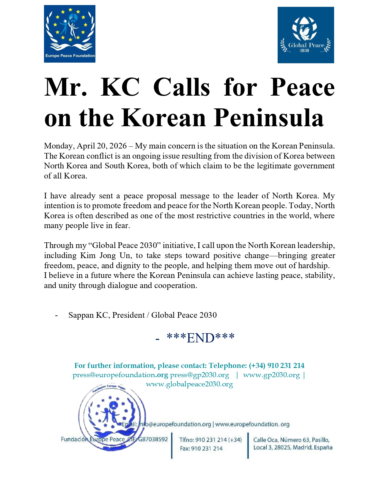 Through my “Global Peace 2030” initiative, I call upon the North Korean leadership, including Kim Jong Un, to take steps toward positive change—bringing greater freedom, peace, and dignity to the people, and helping them move out of hardship.