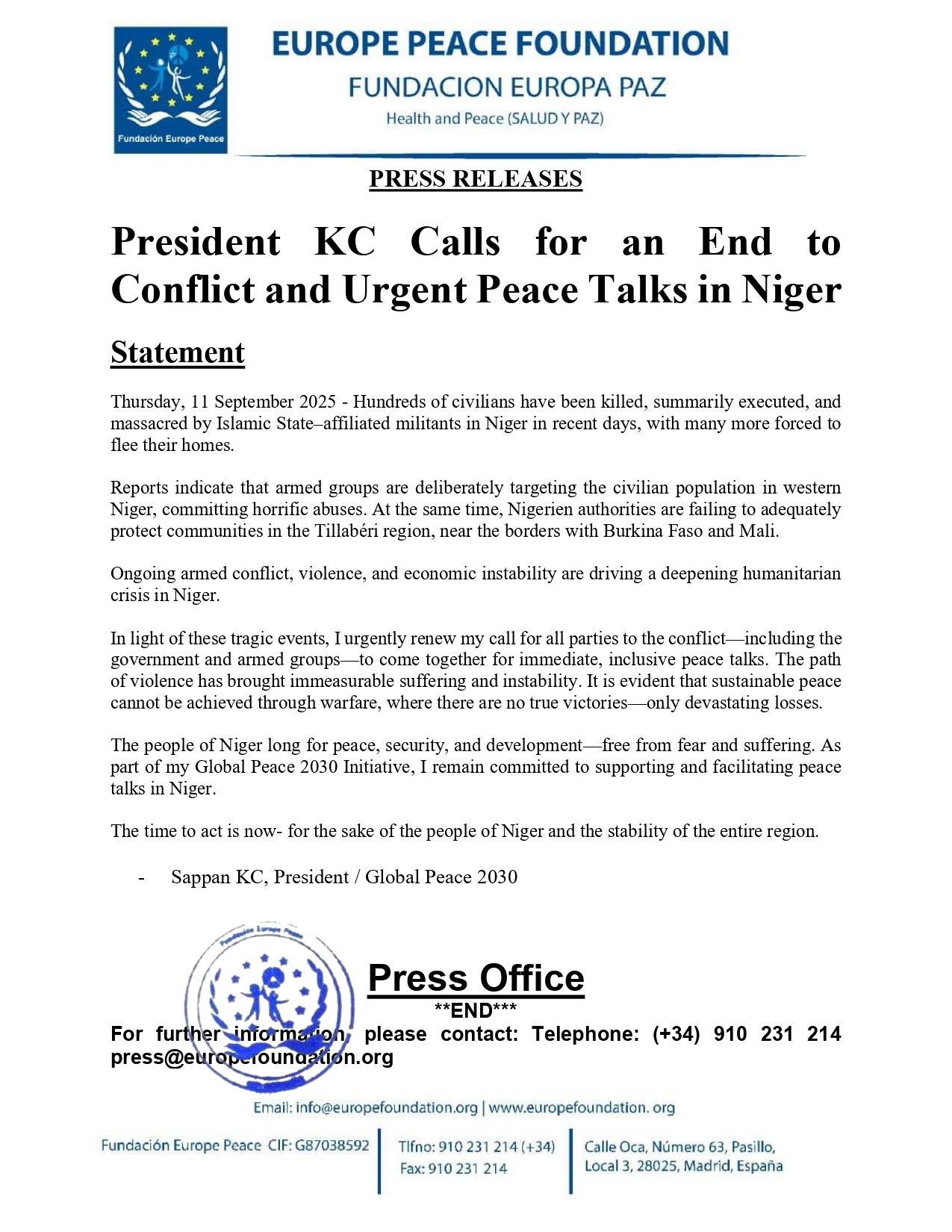The people of Niger long for peace, security, and development—free from fear and suffering. As part of my Global Peace 2030 Initiative, I remain committed to supporting and facilitating peace talks in Niger.