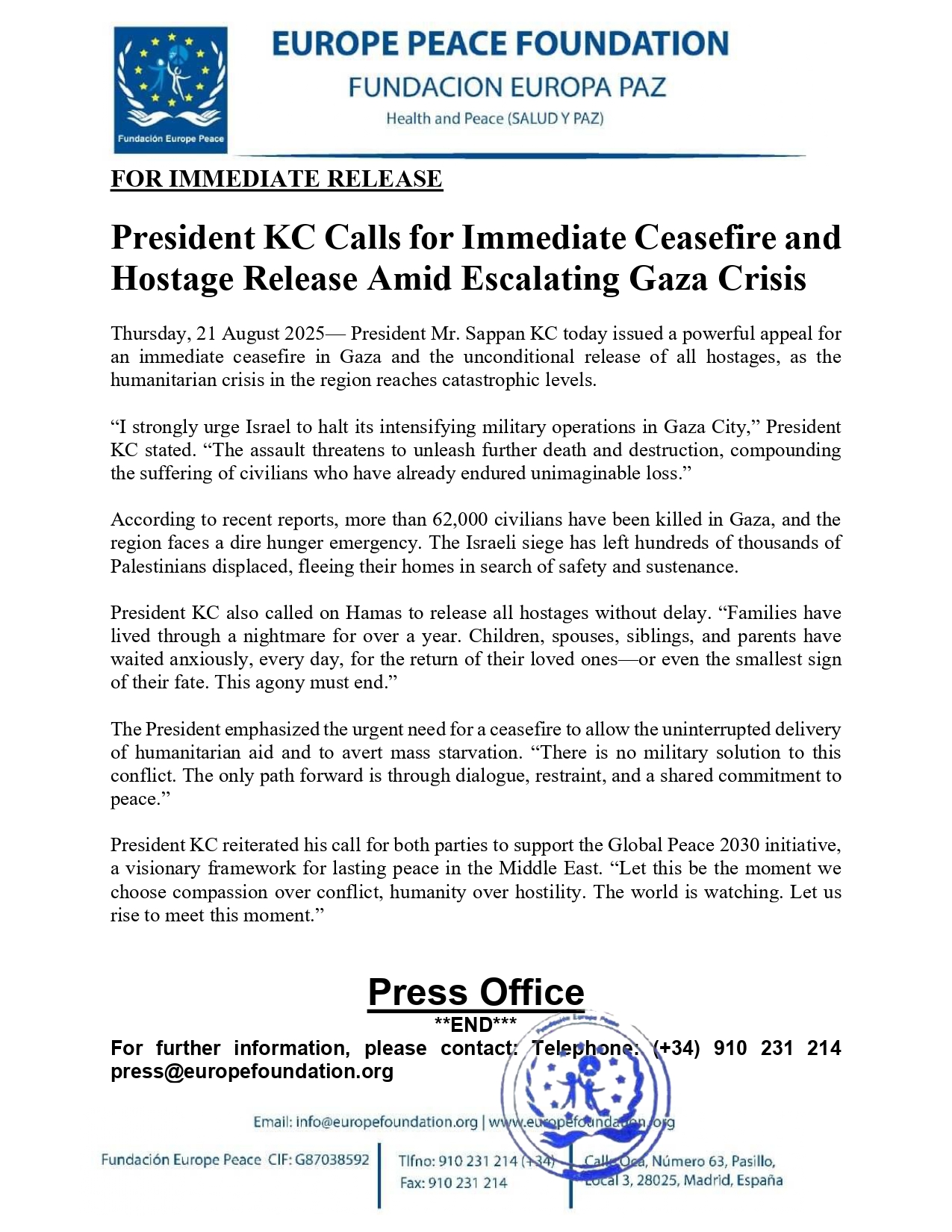 Thursday, 21 August 2025— President Mr. Sappan KC today issued a powerful appeal for an immediate ceasefire in Gaza and the unconditional release of all hostages, as the humanitarian crisis in the region reaches catastrophic levels.