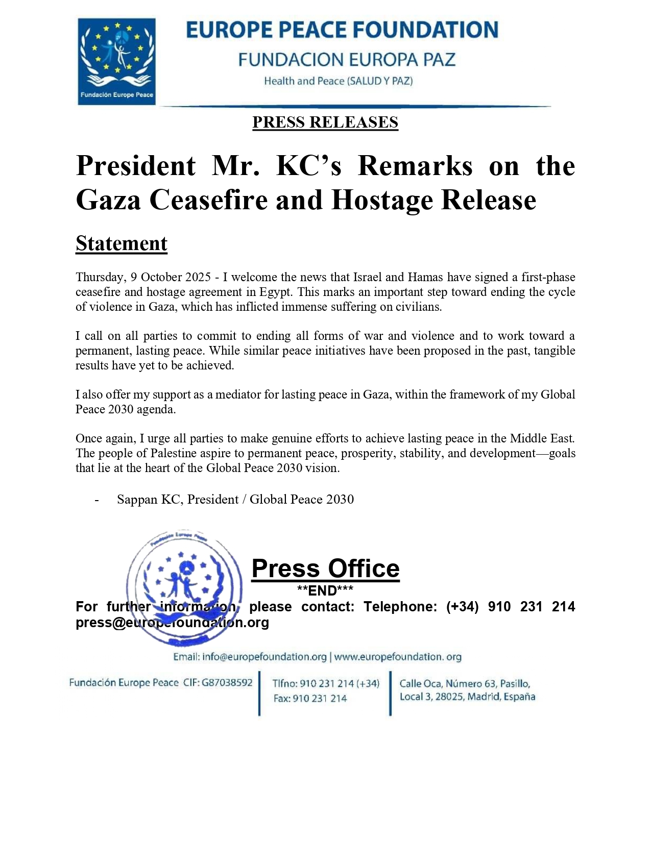 Thursday, 9 October 2025 – I welcome the news that Israel and Hamas have signed a first-phase ceasefire and hostage agreement in Egypt. This marks an important step toward ending the cycle of violence in Gaza, which has inflicted immense suffering on civilians.