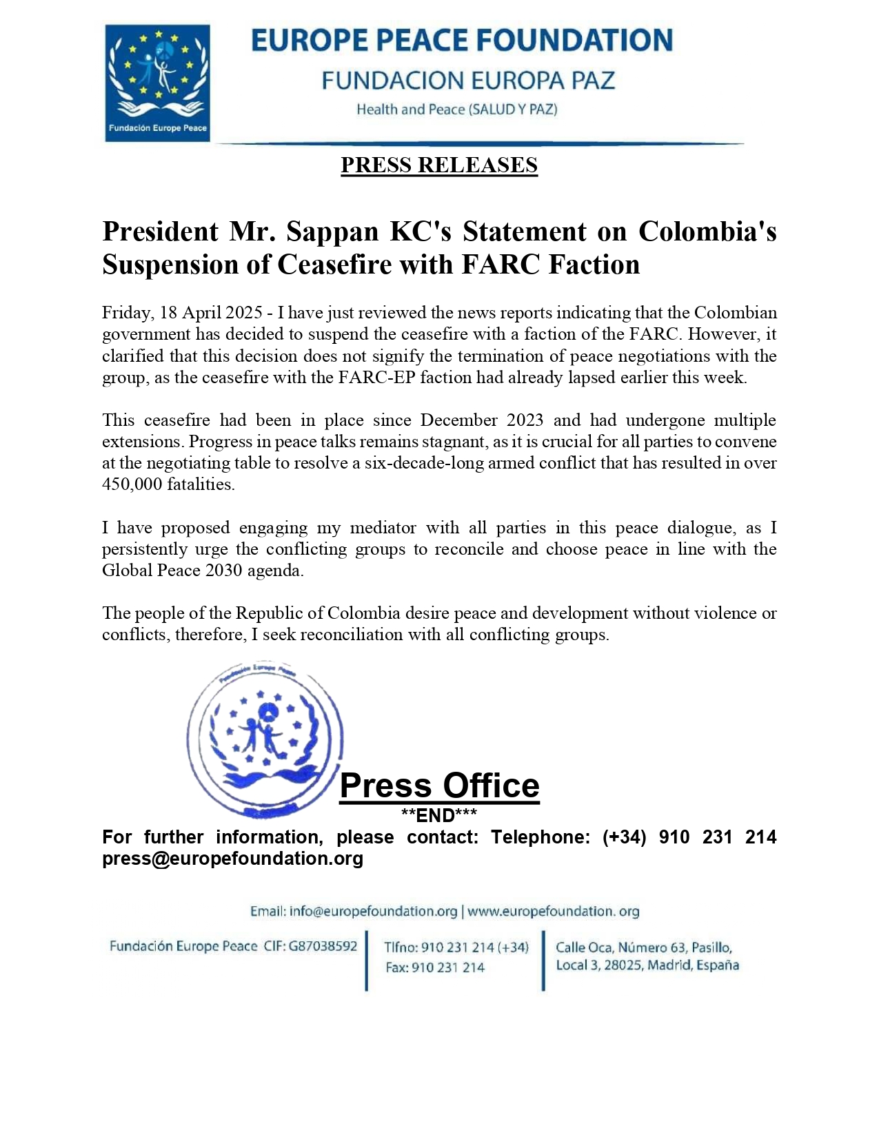 I have proposed engaging my mediator with all parties in this peace dialogue, as I persistently urge the conflicting groups to reconcile and choose peace in line with the Global Peace 2030 agenda.