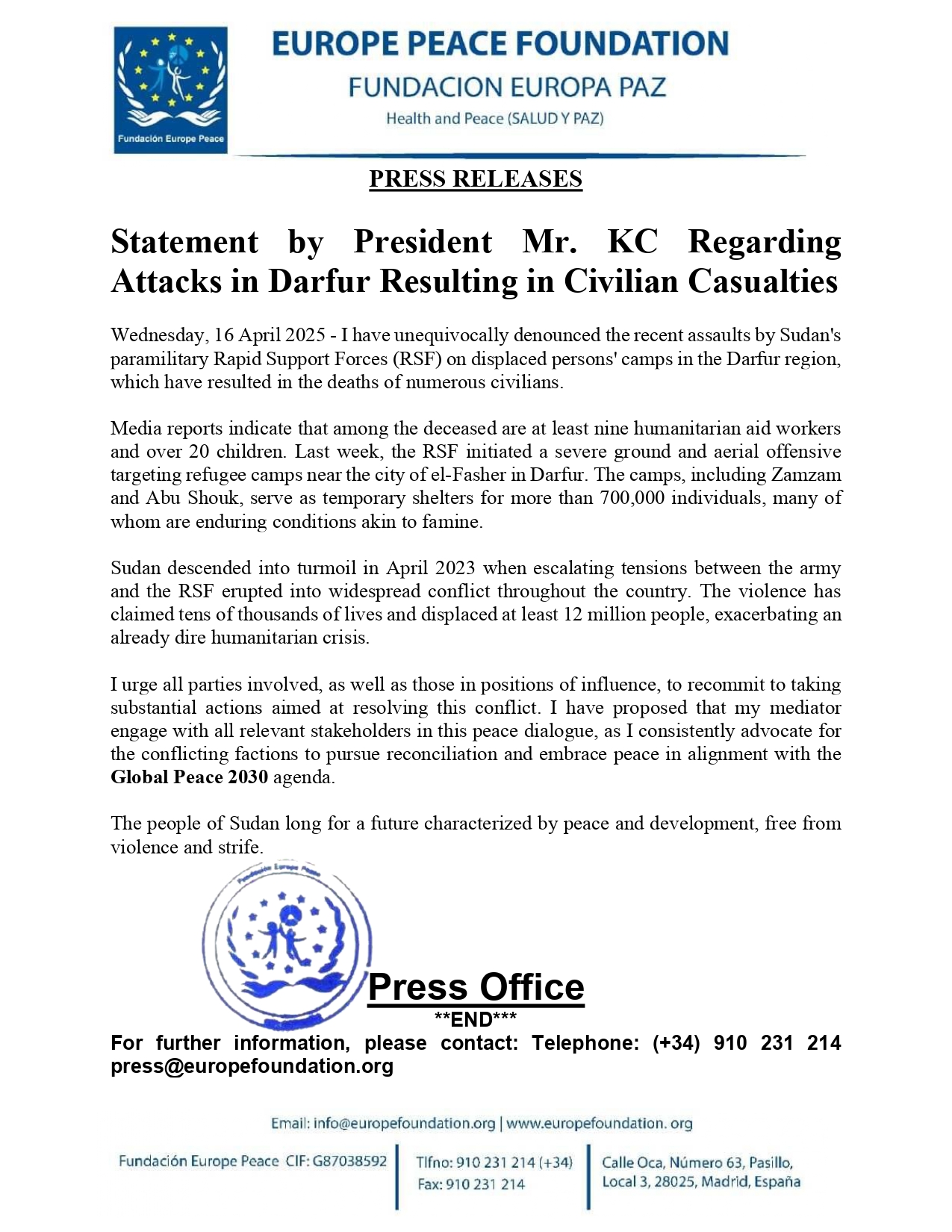 Wednesday, 16 April 2025 – I have unequivocally denounced the recent assaults by Sudan’s paramilitary Rapid Support Forces (RSF) on displaced persons’ camps in the Darfur region, which have resulted in the deaths of numerous civilians.