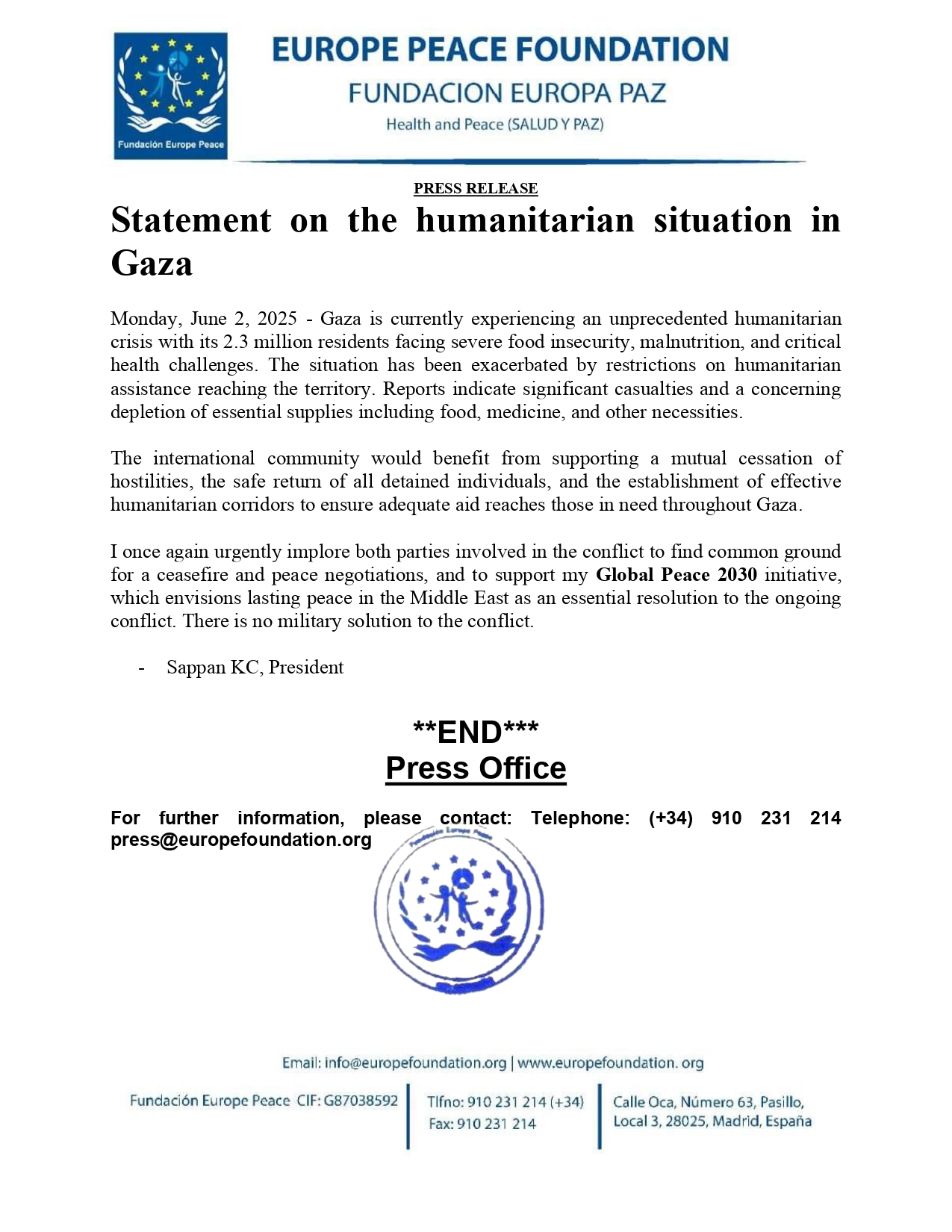 I once again urgently implore both parties involved in the conflict to find common ground for a ceasefire and peace negotiations, and to support my Global Peace 2030 initiative, which envisions lasting peace in the Middle East as an essential resolution to the ongoing conflict. There is no military solution to the conflict.