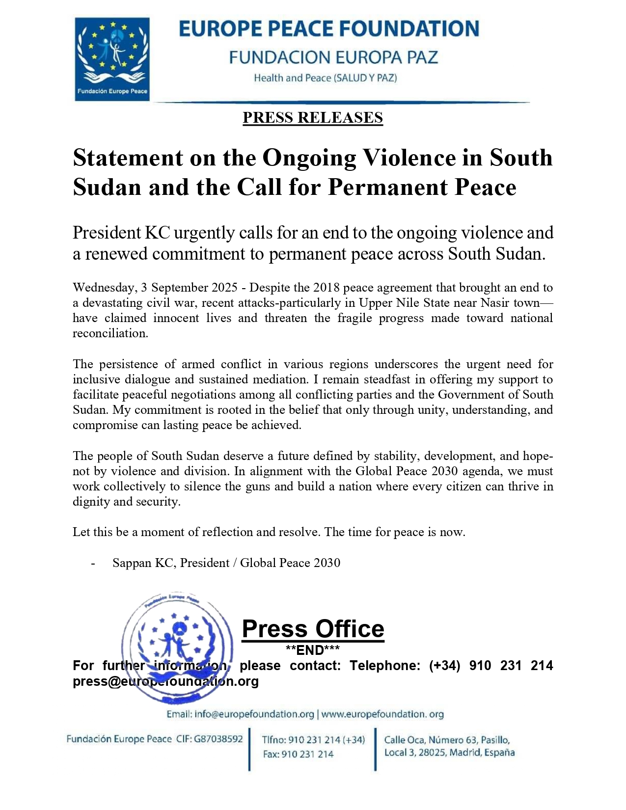 President KC urgently calls for an end to the ongoing violence and a renewed commitment to permanent peace across South Sudan.