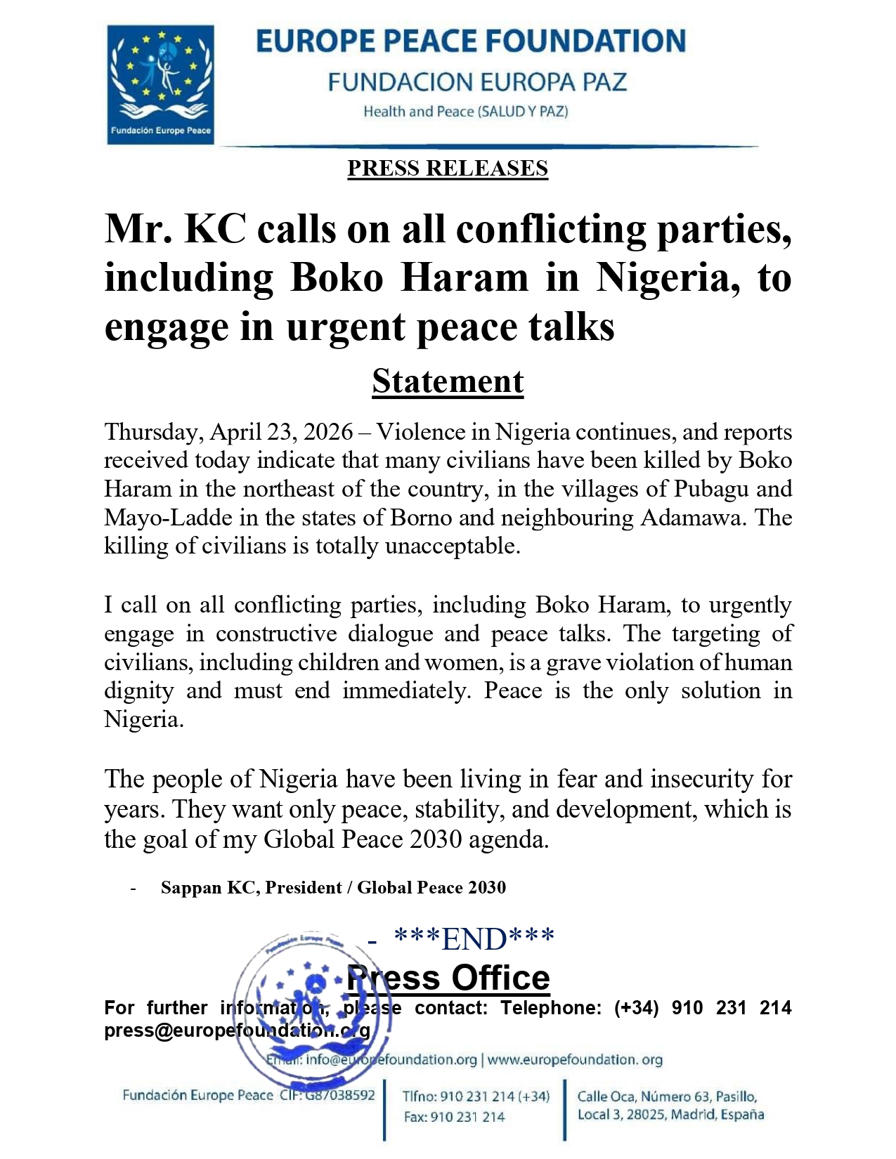 Mr. KC calls on all conflicting parties, including Boko Haram in Nigeria, to engage in urgent peace talks
